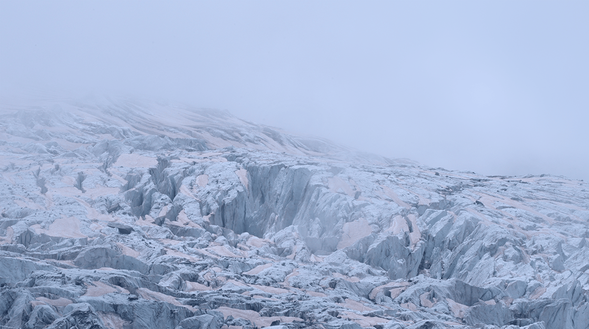 End & Being is Capone’s most ambitious undertaking to date. It confronts the accelerating crisis of a warming planet by documenting a gruelling performance above and beneath the Bossons Glacier—Europe’s most prominent icefall, situated on the Mont Blanc massif in France. Over 89 consecutive days, Capone journeyed alone on foot to one of three remote locations, recording one minute of silence each day in the presence of melting ice. This commitment saw him traverse 1,864 kilometres and ascend 151,122 vertical metres across hazardous terrain. His experiences form the basis of an immersive video installation and related works that register glacial transformation and the vulnerability of both landscape and body.